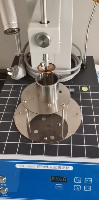本仪器是根据中华人民共和国标准2020年药典四部《0983锥入度测定法》技术要求和有关规定设计制造的,主要适用于适用于软膏剂、眼膏剂及其常用基质材料(如凡士林、羊毛脂、蜂蜡)等半固体物质,以控制其软硬度和黏稠度等性质,避免影响药物的涂布延展性。药物锥入度系指利用自由落体运动,在25℃下,将一定质量的锥体由锥入度仪向下释放,测定锥体释放后5秒内剌入供试品的深度。